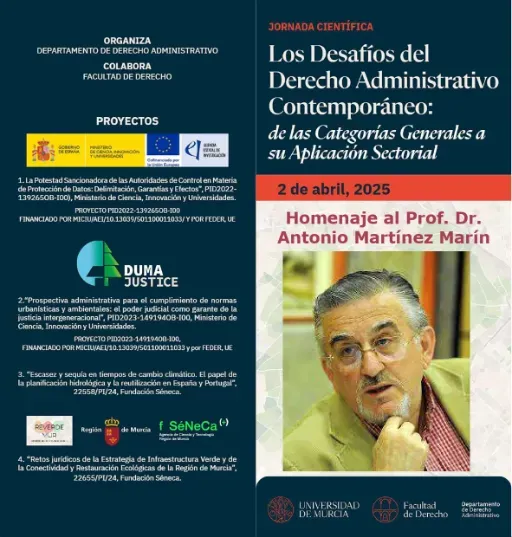 Acto Homenaje Antonio Martínez Marín. El próximo día 2 de abril de 2025 tendrá lugar, en el Salón de grados d ela Facultad de Derecho, la Jornada Científica “Los desafíos del Derecho Administrativo contemporáneo” en la que colabora el proyecto REVERDEMUR.
